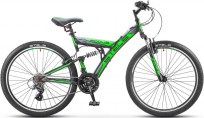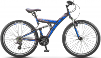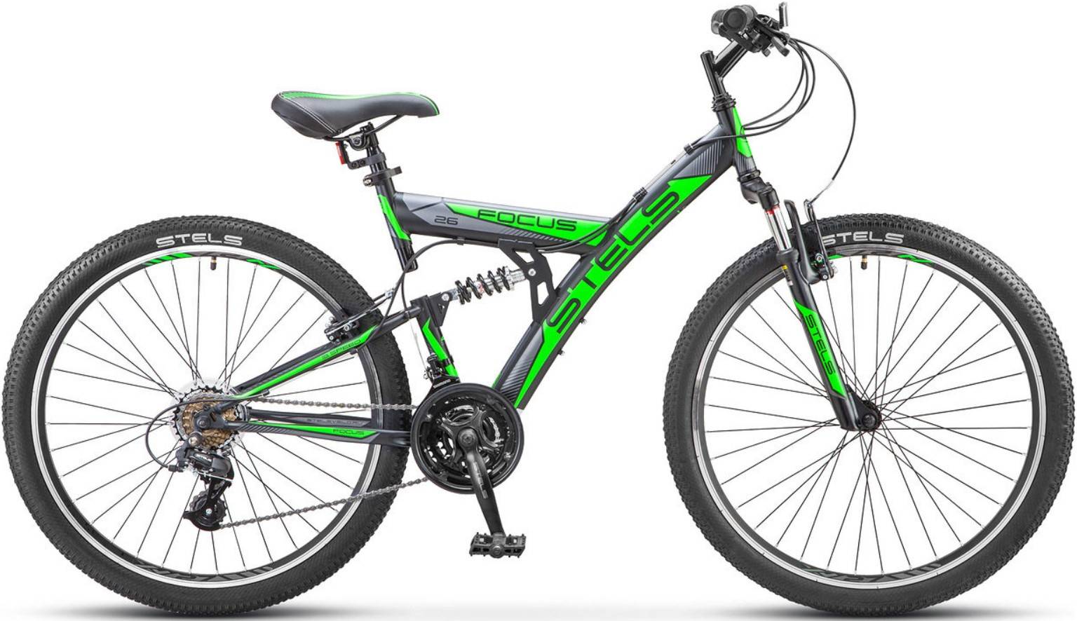 Stels Focus V 26 18-sp 26" модель относится к горному классу двухподвесного велосипеда. Два амортизатора повышают комфорт и управляемость над велосипедом в условиях трудно проходимого бездорожья и некачественного покрытия дорог. Двойная система амортизации уменьшает нагрузку на спину от вибраций при преодолении дорожных препятствий в виде бугров, ям, бордюров. Стелс Фокус В 18 имеет не только отличную комплектацию навесным оборудованием, но и яркий брутальный дизайн с максимально усиленной геометрией рамы. Основные преимущества горного двухподвесного велосипеда Stels:
